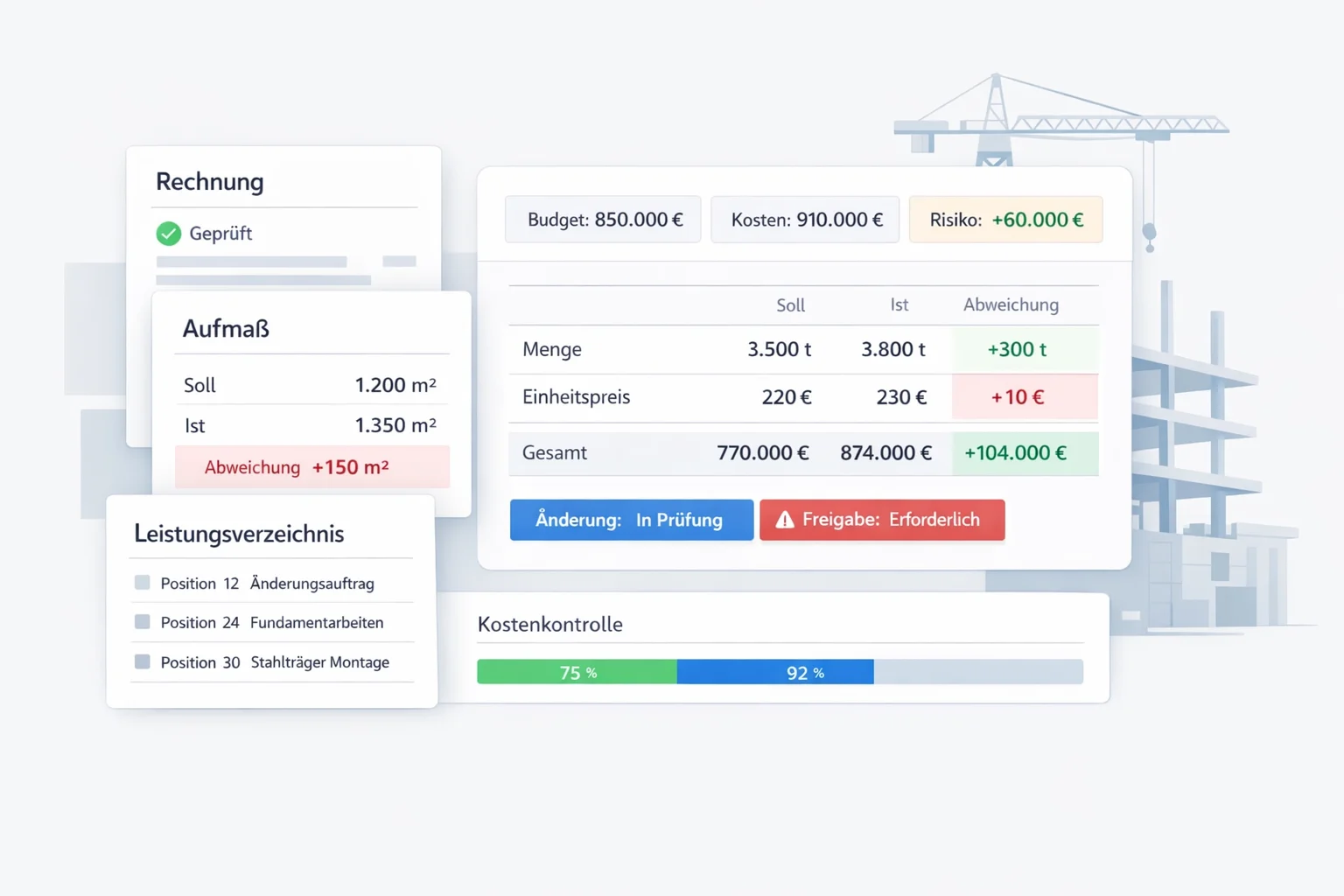 Stillstände, Terminverschiebungen und Nachträge im Industriebau wirken sich unmittelbar auf Kosten und Produktionsabläufe aus. Prüfentscheidungen müssen deshalb schnell, belastbar und jederzeit nachvollziehbar getroffen werden. Zaster führt Nachtrags-, Mengen- und Rechnungsprüfung in einem gemeinsamen, entscheidungsfähigen Prüfprozess zusammen.